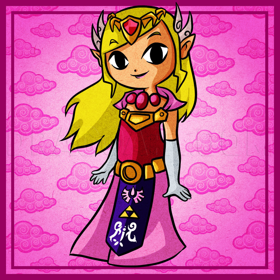 In the center of her forehead draw a curved diamond shape with another smaller diamond inside it. 09052010 Draw toon Zelda characters. Well because these items appear first to the eye of the observer its easier to sketch in those parts of the character parts that arent obscured by the weapons last.
